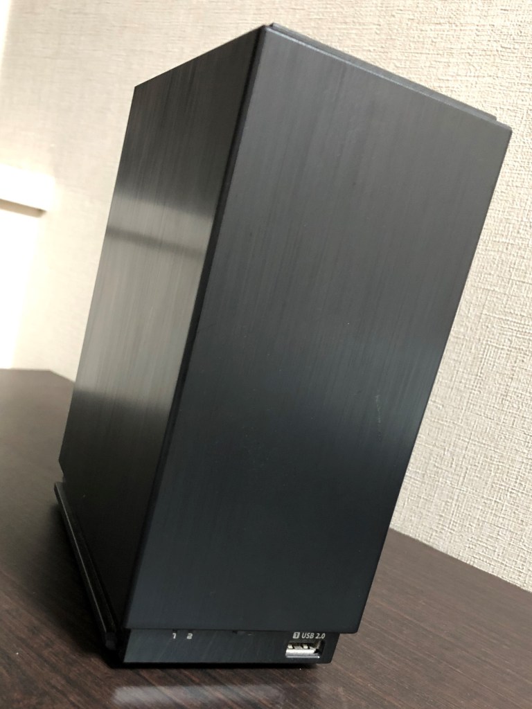 私が現在作業部屋に置いているNASは、写真のように黒い箱型の躯体です。この機械の場合、中に容量2TBのHDDが2台内蔵されています。
