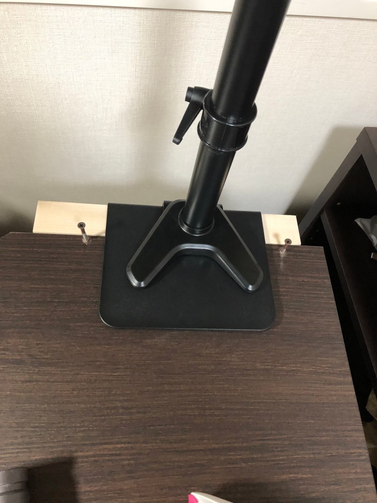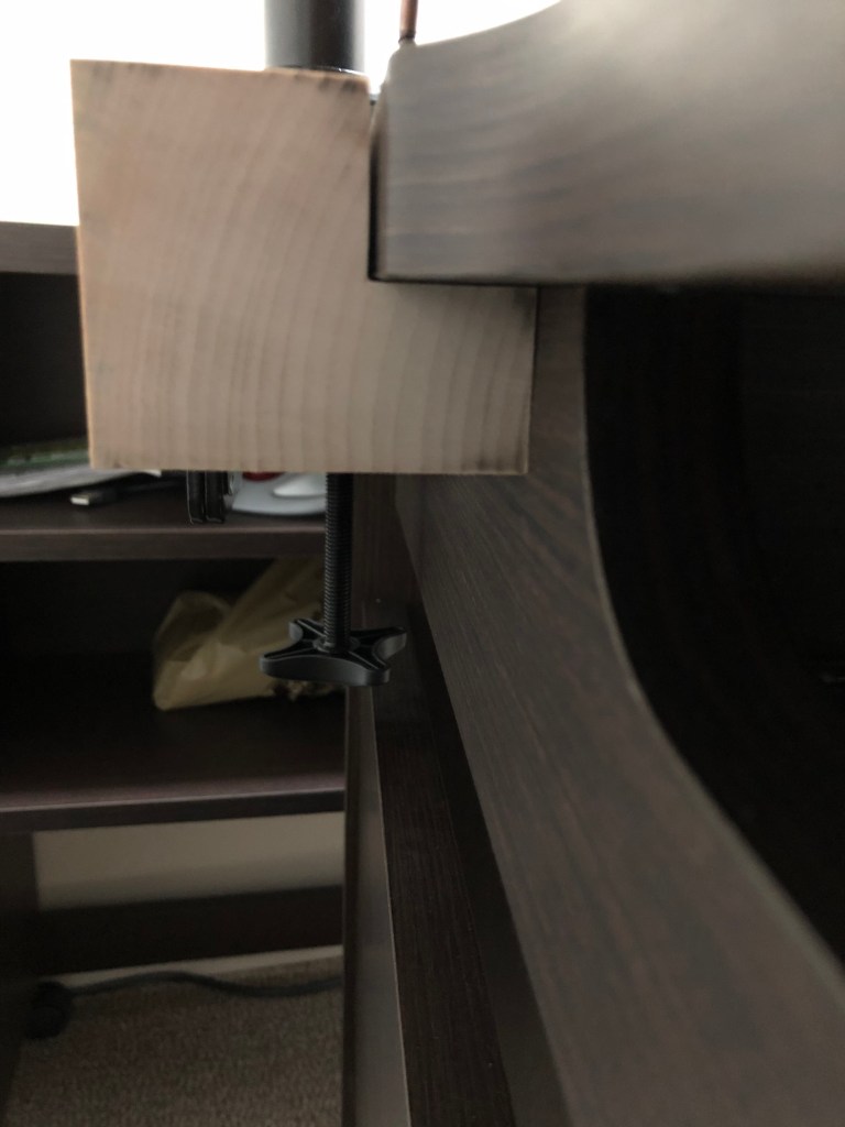 この方法を選んでしまった以上背に腹は代えられないので天板にビス打ちもしてます。そこそこいいお値段のデスクを傷物にしてしまった…。しかしながら傷物にした甲斐もあって、固定力は抜群!初めはどうなるかと思いましたが
