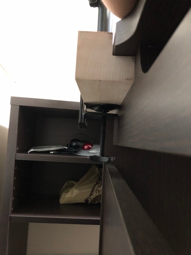 程無くして無事に我が家に納品されたアームを取り付けるべく、早速デスクの裏に回り込んで挟み込もうとしたところで問題発生。