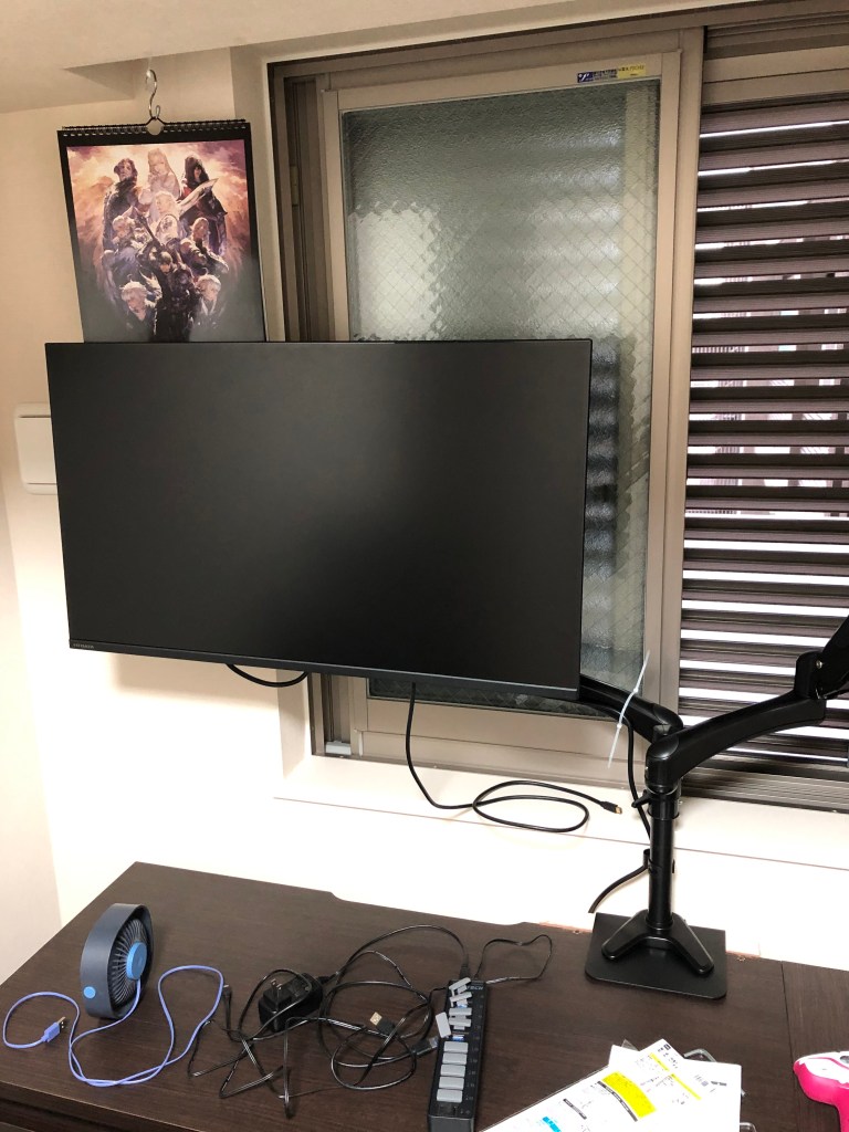 上の写真のように無事にモニターを取り付け。31.5インチのモニターなのでやや重いですが、何てことなくしっかりと浮いています。