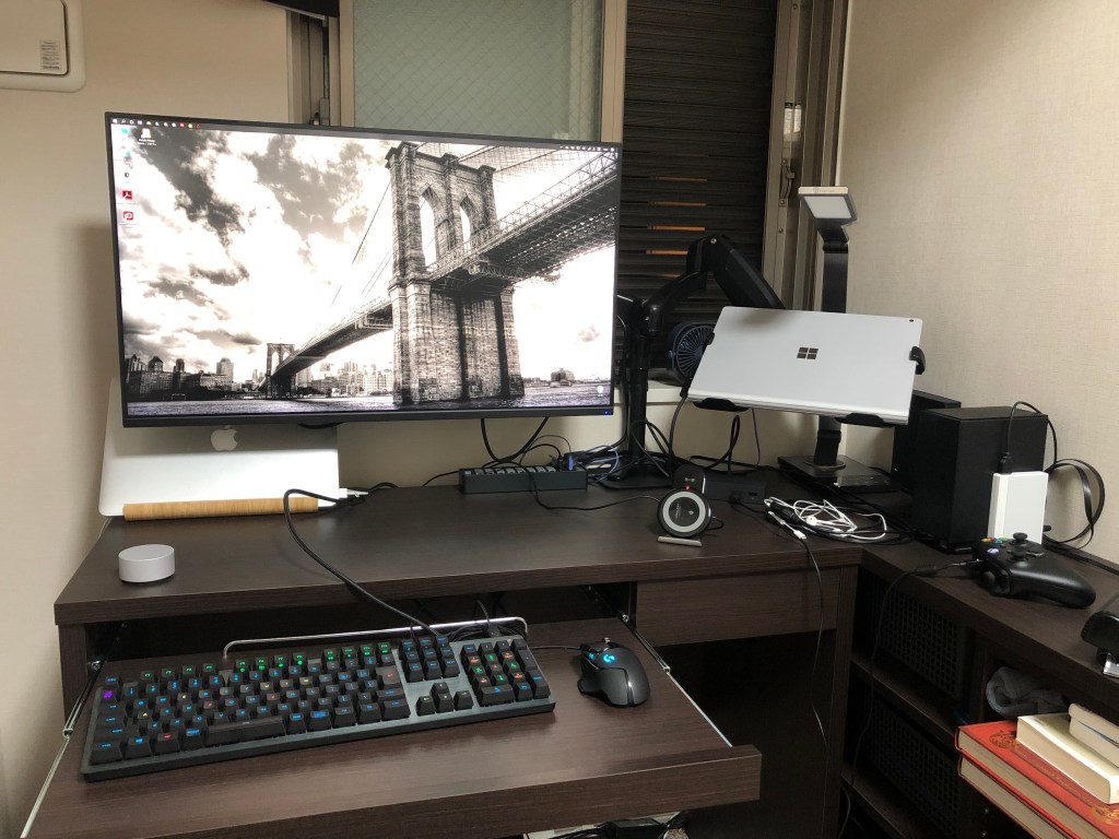 このデスク環境になってから数週間過ごしてますが、本当に快適です。モニターの高さや角度も自由自在ですし。モニターアームに取り付け出来るラップトップトレイも購入したので、Surface Bookも浮いてます。